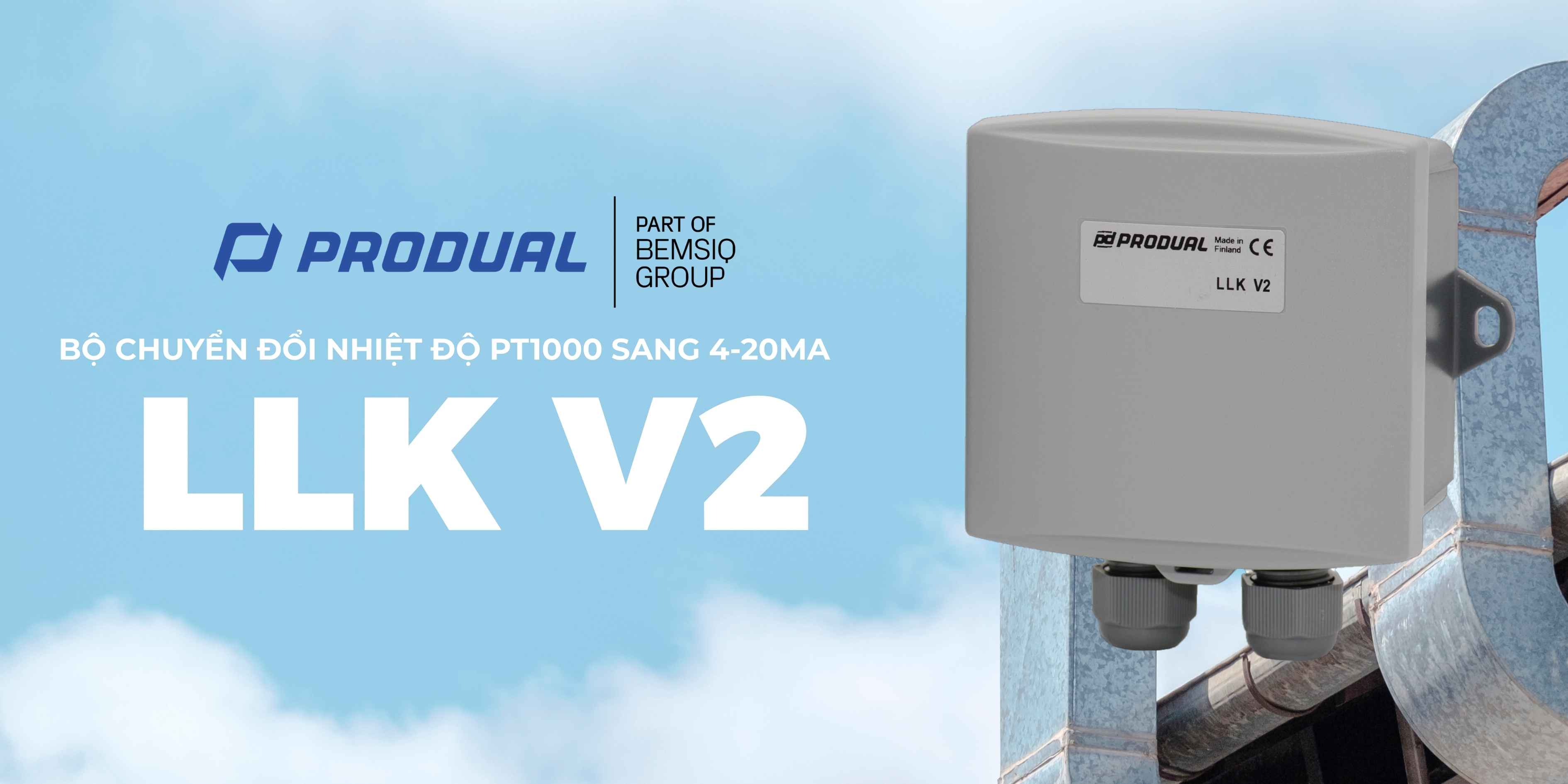 BỘ CHUYỂN ĐỔI NHIỆT ĐỘ PT1000 SANG 4-20MA LLK V2 là bộ chuyển đổi tín hiệu nhiệt độ (temperature transmitter) thuộc dòng LLK V2 của Produal, thiết kế để kết nối với bất kỳ cảm biến nào sử dụng nguyên tố Pt1000 (không kèm theo). Thiết bị chuyển đổi giá trị kháng trở của Pt1000 thành tín hiệu analog tuyến tính 4-20 mA (2-wire loop-powered), phù hợp truyền dữ liệu đến bộ điều khiển, PLC hoặc hệ thống BMS. Dải đo nhiệt độ có thể tùy chỉnh linh hoạt trong quá trình commissioning bằng công cụ ML-SER, hỗ trợ hiệu chỉnh một điểm tại hiện trường (one-point field calibration) và chuyển đổi đầu ra từ đo nhiệt độ sang chức năng điều khiển (controller output) để điều khiển van, bơm hoặc thiết bị khác. Phiên bản này không có màn hình hiển thị, tập trung vào chuyển đổi tín hiệu chính xác, ổn định và tiết kiệm chi phí lắp đặt. Đây là giải pháp chuyển đổi tín hiệu Pt1000 sang 4-20 mA phổ biến trong các hệ thống HVAC/R, đo nhiệt độ nước, không khí, cuộn sưởi, chiller.