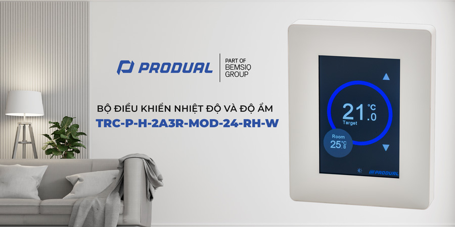 BỘ ĐIỀU KHIỂN NHIỆT ĐỘ VÀ ĐỘ ẨM GẮN PHÒNG PRODUAL TRC-P-H-2A3R-MOD-24-RH-W tích hợp cảm biến đo nhiệt độ và cảm biến độ ẩm tương đối (RH) cùng bộ xử lý tín hiệu nhằm giám sát điều kiện môi trường trong không gian kín. Thiết bị không chỉ thực hiện chức năng đo lường mà còn truyền dữ liệu về hệ thống điều khiển trung tâm thông qua Modbus RTU. Dựa trên dữ liệu thực tế, hệ thống HVAC có thể điều chỉnh làm lạnh, sưởi hoặc kiểm soát độ ẩm khi thông số vượt ngưỡng cài đặt, giúp duy trì môi trường ổn định và đảm bảo sự thoải mái cho người sử dụng.