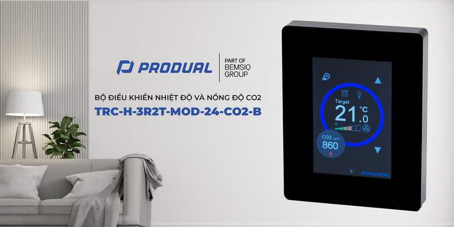 Bộ điều khiển nhiệt độ và nồng độ CO2 phòng PRODUAL TRC-H-3R2T-MOD-24-CO2-B là thiết bị tích hợp cảm biến đo nhiệt độ, cảm biến CO2 và bộ xử lý tín hiệu nhằm giám sát điều kiện môi trường trong không gian kín. Thiết bị không chỉ đo lường mà còn truyền dữ liệu về hệ thống điều khiển trung tâm thông qua Modbus RTU. Dựa trên thông số thực tế, hệ thống HVAC có thể điều chỉnh làm lạnh, sưởi hoặc tăng lưu lượng gió tươi khi nồng độ CO2 vượt ngưỡng cài đặt. Việc điều khiển theo dữ liệu thực tế giúp đảm bảo sự thoải mái, nâng cao chất lượng không khí và bảo vệ thiết bị trong không gian sử dụng.