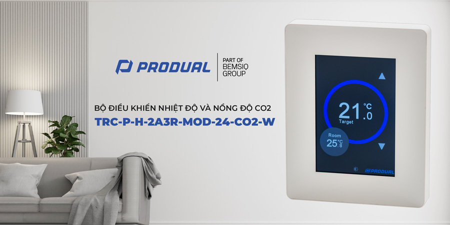 BỘ ĐIỀU KHIỂN NHIỆT ĐỘ VÀ NỒNG ĐỘ CO2 GẮN PHÒNG PRODUAL TRC-P-H-2A3R-MOD-24-CO2-W tích hợp cảm biến đo nhiệt độ và cảm biến CO2 công nghệ hồng ngoại (NDIR) cùng bộ xử lý tín hiệu nhằm giám sát chất lượng môi trường không khí trong phòng kín. Thiết bị không chỉ thực hiện chức năng đo lường mà còn truyền dữ liệu về hệ thống điều khiển trung tâm thông qua Modbus RTU. Dựa trên dữ liệu thực tế, hệ thống HVAC có thể điều chỉnh làm lạnh, sưởi hoặc tăng cường thông gió khi thông số vượt ngưỡng cài đặt, giúp duy trì môi trường ổn định và đảm bảo chất lượng không khí trong nhà (IAQ).