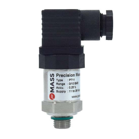 Cảm biến áp suất PT11 của hãng MASS được làm từ thép không rỉ SS316L cao cấp cho các ứng dụng đo áp suất chất lỏng hơi, khí công nghiệp sử dụng nguyên lý Piezo resistive cho độ ổn định cao, bền bỉ, chống ăn mòn hóa chất dùng cho dầu, chất lỏng thủy lực.