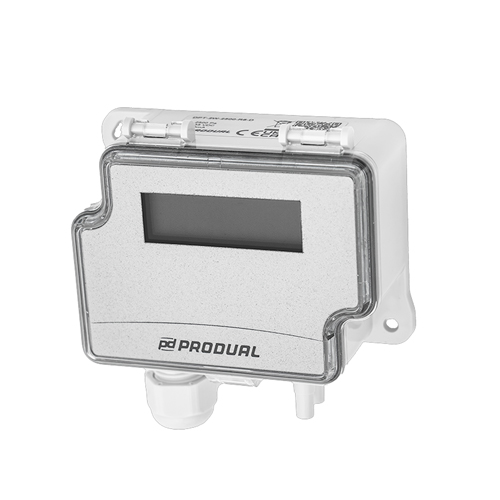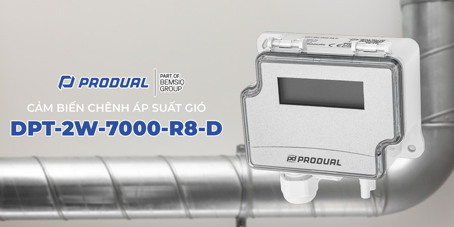 CẢM BIẾN CHÊNH ÁP SUẤT GIÓ DPT-2W-7000-R8-D (dải đo 7000 pa, 4-20mA, 2 dây) là thiết bị đo sự chênh lệch áp suất không khí giữa hai điểm trong hệ thống HVAC hoặc hệ thống thông gió công nghiệp.Sản phẩm thuộc dòng DPT-2W differential pressure transmitter của Produal - Phần Lan, được đánh giá là một trong những dòng bộ truyền chênh áp tiên tiến dành cho hệ thống HVAC/R và tự động hóa tòa nhà. Thiết bị có khả năng đo áp suất tĩnh và chênh áp không khí với độ ổn định và độ chính xác cao. Đặc biệt ProdualDPT-2W-7000-R8-D được trang bị màn hình hiển thị LCD giúp người vận hành dễ dàng theo dõi giá trị chênh áp trực tiếp tại vị trí lắp đặt.