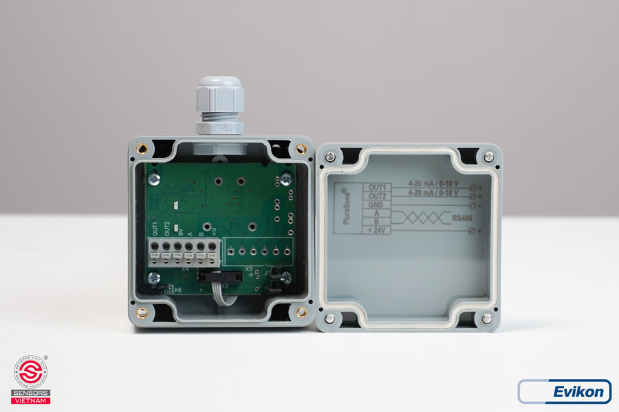 - Đầu ra: 2 ngõ analog (4-20 mA hoặc 0-10 V, cài đặt được) và RS485 Modbus RTU.