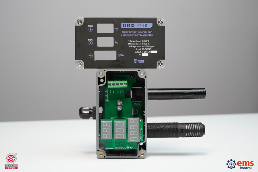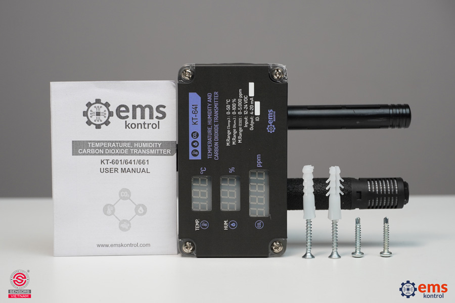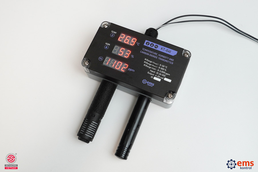 KT-641 là thiết bị đo lường đa năng (3 trong 1) cao cấp thuộc dòng KT-6X1 của hãng EMS Kontrol. Cảm biến KT-641 cho phép đo lường chính xác nhiệt độ, độ ẩm tương đối và nồng độ khí CO2, sau đó chuyển đổi các giá trị này thành tín hiệu dòng điện analog 4-20 mA chuẩn công nghiệp để truyền về hệ thống điều khiển trung tâm
