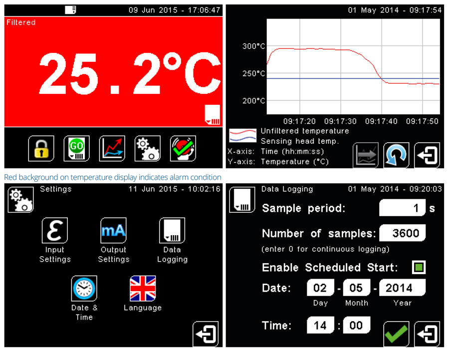 Mô-đun BRT hỗ trợ hiển thị nhiệt độ hiện tại, giá trị trung bình, đỉnh/đáy, trạng thái relay, thiết lập ngưỡng cảnh báo độc lập, ghi dữ liệu lên MicroSD (tối đa 32GB), và điều chỉnh thông số emissivity, averaging, peak/valley hold ngay trên màn hình cảm ứng hoặc phần mềm Modbus.