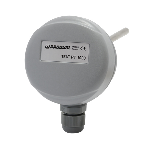 CẢM BIẾN NHIỆT ĐỘ ỐNG NƯỚC TEAT PT 1000 là cảm biến nhiệt độ ngâm (immersion temperature sensor) thuộc dòng TEAT của Produal, thiết kế chuyên dụng để đo nhiệt độ nước làm nóng/lạnh trong hệ thống tự động hóa HVAC/R. Thiết bị sử dụng cảm biến Pt1000 (1000 Ω tại 0 °C) theo tiêu chuẩn quốc tế EN 60751, đảm bảo độ chính xác cao, độ lặp lại tốt và ổn định lâu dài trong dải nhiệt độ rộng. Cảm biến luôn lắp đặt trong pocket (ống bảo vệ) để đo trực tiếp trong dòng nước, với ren R1/2” gắn vào đường ống. Pocket có các vật liệu tùy chọn (xem datasheet TEAT pocket), phù hợp cho nước thông thường, nước có tính ăn mòn hoặc môi trường hóa chất nhẹ. Đầu dò dài 80 mm lý tưởng cho đường ống lớn hoặc vị trí cần đo sâu trong dòng chảy. Ngoài ra, cảm biến có thể dùng đo nhiệt độ không khí trong ống gió với phụ kiện flange MT4270. Vỏ nhựa chịu nhiệt, nắp lưỡi lê và khối đầu nối nghiêng 45° giúp lắp đặt dễ dàng và đấu nối dây thuận tiện. Đây là giải pháp tối ưu cho giám sát nhiệt độ nước trong các hệ thống HVAC/R thương mại và công nghiệp.