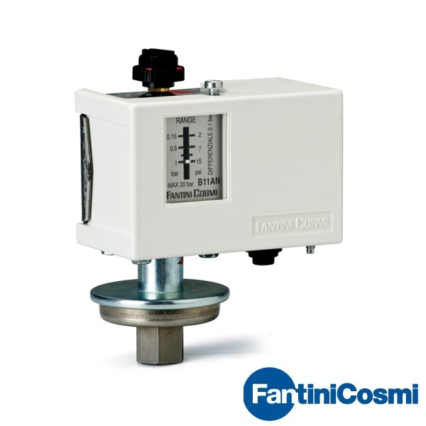 Công tắc áp suất nước B11AN của Hãng FANTINI COSMI - ITALY hay còn gọi là công tắc báo quá áp suất gắn ống nước là sự kết hợp của bộ tiếp điểm đóng ngắt dạng relay với một cảm biến áp suất. Công tắc áp suất cho phép giám sát áp suất đường ống nước đến ngưỡng cài đặt, sau đó sẽ tác động relay đóng hoặc ngắt một thiết bị ngoại vi trên hệ thống như van xả, bơm, hệ thống tự động. Công tắc áp suất hoạt động hoàn toàn tự động theo ngưỡng cài đặt trước.
