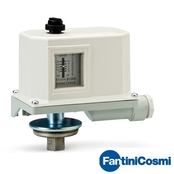 Công tắc áp suất nước B12ANY của Hãng FANTINI COSMI - ITALY hay còn gọi là công tắc báo quá áp suất gắn ống nước là sự kết hợp của bộ tiếp điểm đóng ngắt dạng relay với một cảm biến áp suất. Công tắc áp suất cho phép giám sát áp suất đường ống nước đến ngưỡng cài đặt, sau đó sẽ tác động relay đóng hoặc ngắt một thiết bị ngoại vi trên hệ thống như van xả, bơm, hệ thống tự động. Công tắc áp suất hoạt động hoàn toàn tự động theo ngưỡng cài đặt trước.