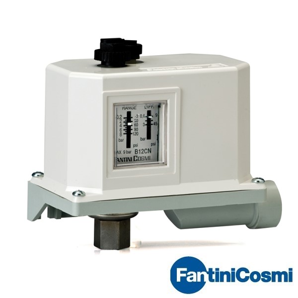 Công tắc áp suất nước B12CNY của Hãng FANTINI COSMI - ITALY hay còn gọi là công tắc báo quá áp suất gắn ống nước là sự kết hợp của bộ tiếp điểm đóng ngắt dạng relay với một cảm biến áp suất. Công tắc áp suất cho phép giám sát áp suất đường ống nước đến ngưỡng cài đặt, sau đó sẽ tác động relay đóng hoặc ngắt một thiết bị ngoại vi trên hệ thống như van xả, bơm, hệ thống tự động. Công tắc áp suất hoạt động hoàn toàn tự động theo ngưỡng cài đặt trước.