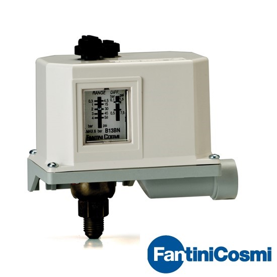 Công tắc áp suất nước B13CNY của Hãng FANTINI COSMI - ITALY hay còn gọi là công tắc báo quá áp suất gắn ống nước là sự kết hợp của bộ tiếp điểm đóng ngắt dạng relay với một cảm biến áp suất. Công tắc áp suất cho phép giám sát áp suất đường ống nước đến ngưỡng cài đặt, sau đó sẽ tác động relay đóng hoặc ngắt một thiết bị ngoại vi trên hệ thống như van xả, bơm, hệ thống tự động. Công tắc áp suất hoạt động hoàn toàn tự động theo ngưỡng cài đặt trước.