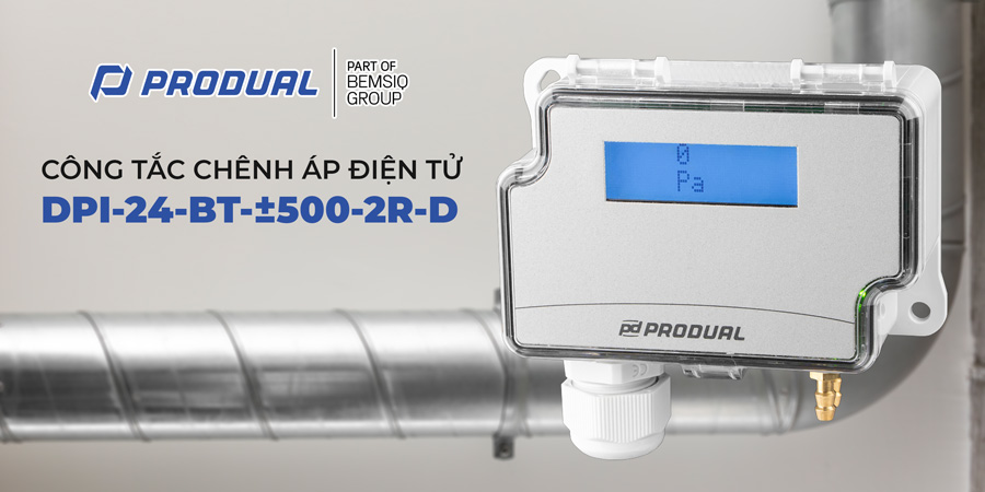 CÔNG TẮC CHÊNH ÁP ĐIỆN TỬ PRODUAL DPI-24-BT-±500-2R-D là công tắc chênh áp gió điện tử tiên tiến, hỗ trợ đo bidirectional (±500 Pa) phù hợp cho các ứng dụng cần phát hiện chênh áp dương và âm (chênh áp cầu thang áp lực dương, phòng sạch áp lực âm, quạt hút/thổi). Thiết bị cho phép cài đặt setpoint chênh áp để kích hoạt 2 rơle độc lập với độ phân giải 1 Pa, hoạt động như công tắc báo động (on-off relay) và bộ truyền tín hiệu chênh áp/lưu lượng khí đa năng. Hỗ trợ tính toán lưu lượng với đầu dò FloXact™ cho ống gió hoặc quạt ly tâm. Cấu hình linh hoạt qua nút bấm/màn hình hoặc Bluetooth (app MyTool® + dongle MyTool Connect), tùy chỉnh đơn vị đo, hysteresis, thời gian delay, hướng hoạt động rơle (rise/fall). Zeroing thủ công bằng nút bấm, đảm bảo độ chính xác ổn định.
