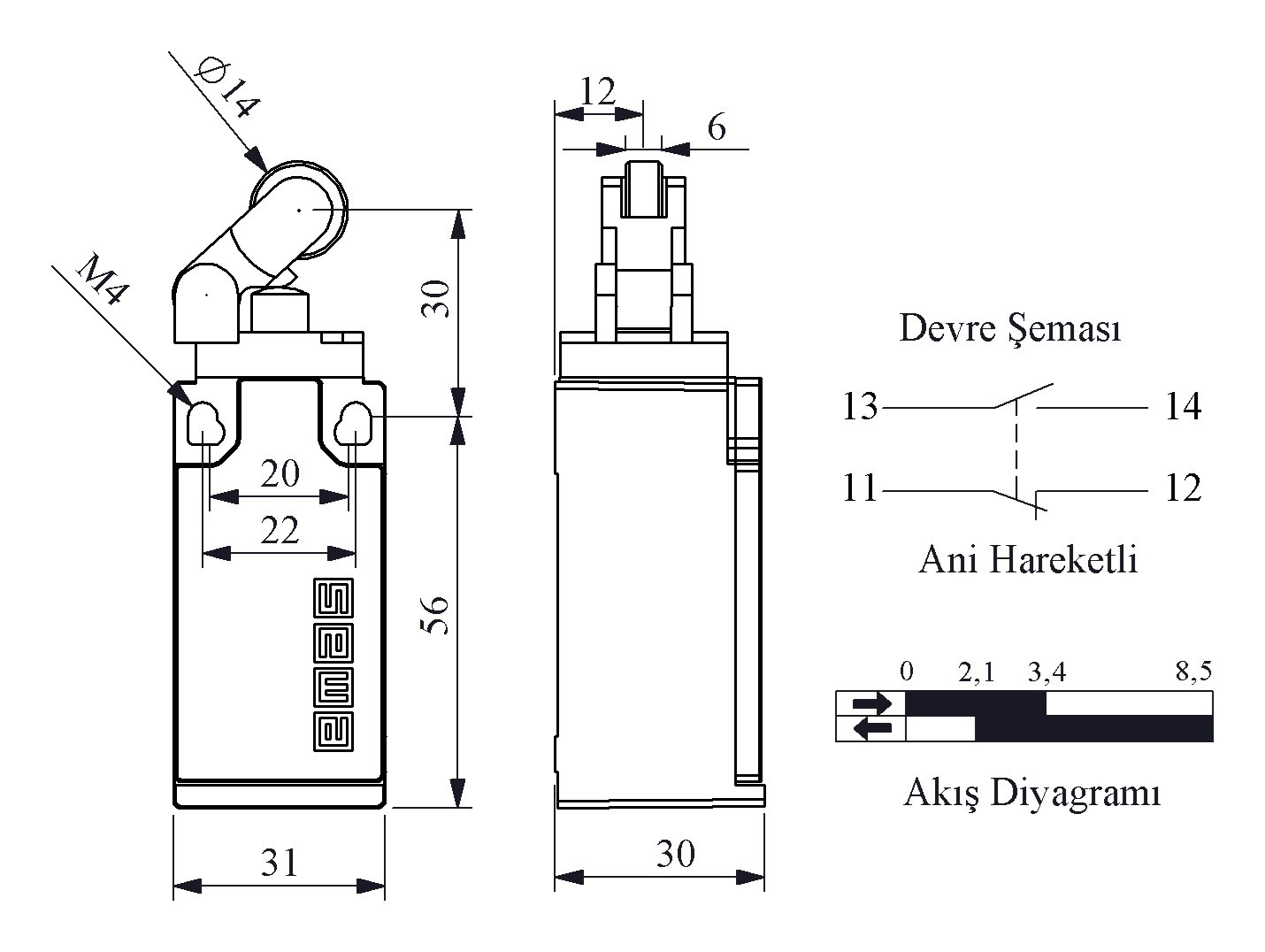 - Cơ cấu truyền động: Cần gạt con lăn kim loại đường kính 14 mm, dạng Roller Lever, được gắn xoay trên trục chắc chắn, tiếp xúc tốt với vật thể di chuyển.