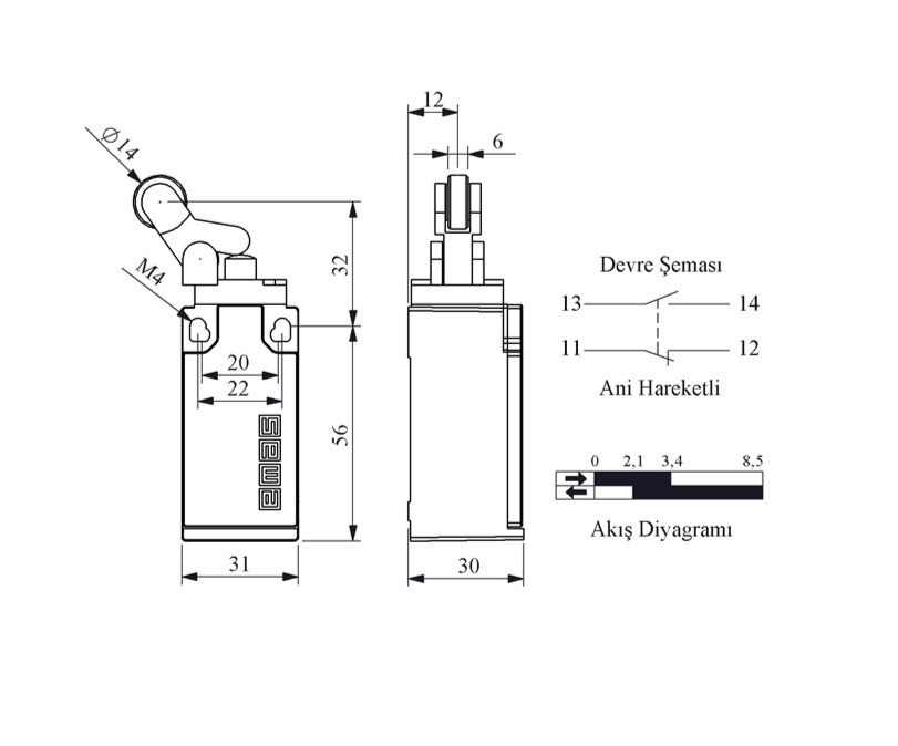 - Cơ cấu truyền động: Cần gạt con lăn kim loại đường kính 14 mm (cần gạt nghiêng/lệch bên), dạng Roller Lever, được gắn xoay trên trục chắc chắn, tiếp xúc tốt với vật thể di chuyển.