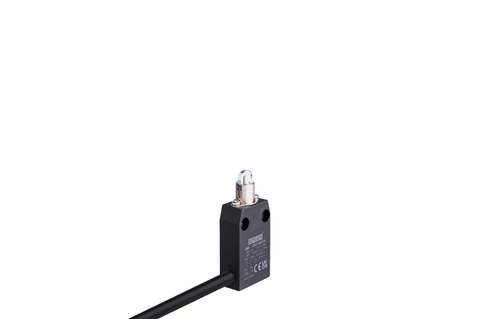 Công tắc hành trình EMAS L66K13MUM331 thuộc series L66 của hãng EMAS - Thổ Nhĩ kỳ. Điểm nổi bật nhất của sản phẩm này là cơ cấu truyền động pít tông con lăn kim loại (đường kính 11mm), kết hợp với tiếp điểm tác động nhanh (Snap Action - cấu hình 1NO + 1NC) và đạt chuẩn bảo vệ lên đến IP67.